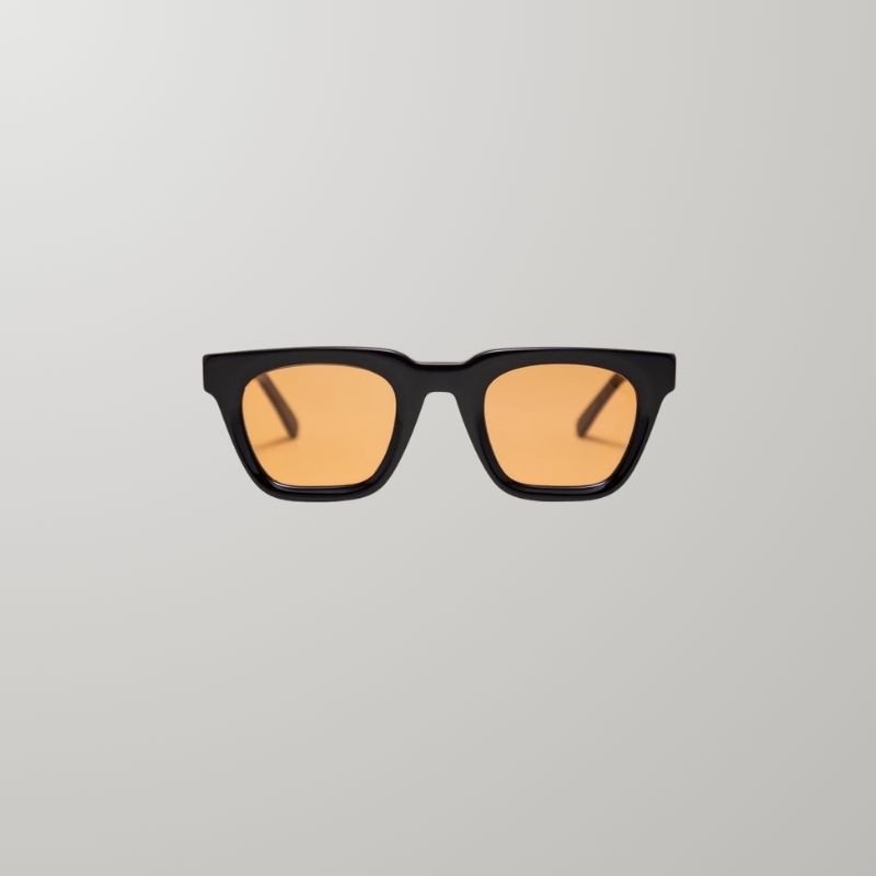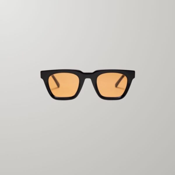 Gafas de sol de acetato color negro de 6mm de grosor, con rebaje en contorno de ojo. Patillas de acetato. Lente orgánica color durazno con 100% protección UV. Plaquetas de acetato incorporadas. Bisagras fijas. Hechas a mano en Argentina.