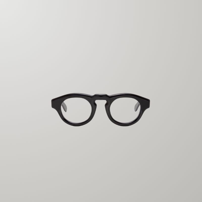 Gafas de vista de acetato color negro de 6mm de grosor con redondeo en contornos. Patillas de acetato. Plaquetas de acetato incorporadas. Bisagras fijas. Hechas a mano en Argentina.