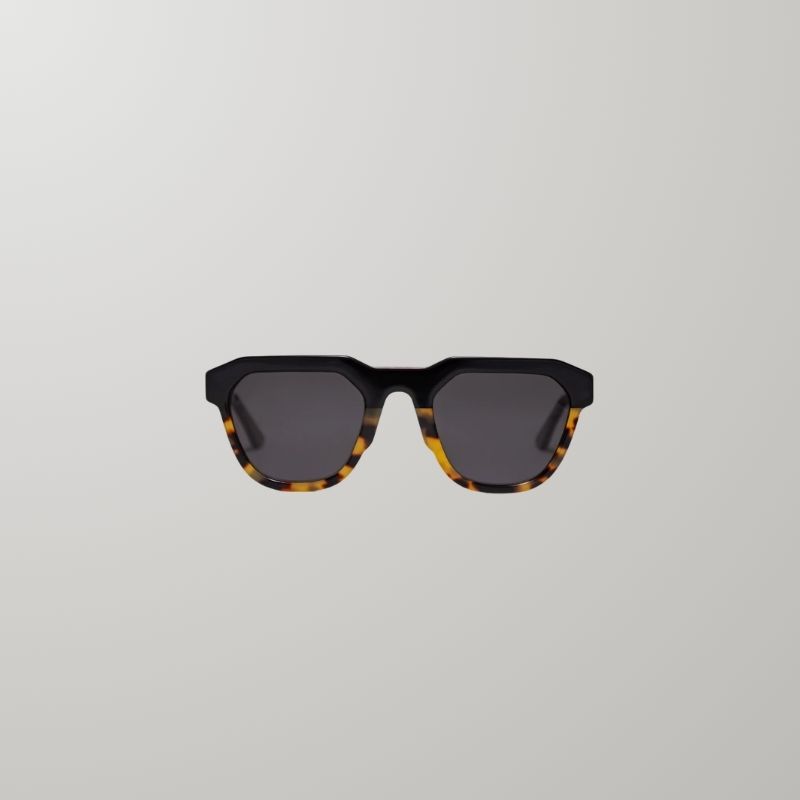 Gafas de sol de acetato italiano bicolor negro y carey de 6mm de grosor. Patillas de acetato negro. Lente orgánica gris con 100% protección UV. Plaquetas de acetato incorporadas. Bisagras fijas. Hechas a mano en Argentina.